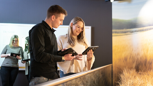 dauern unsere geführten Rundgänge. Danach laden wir euch zum Umtrunk in unsere Bit-Lounge ein. Einzelpersonen und Kleingruppen können unsere Erlebniswelt nach Verfügbarkeit auch mit iPad ganz individuell entdecken.